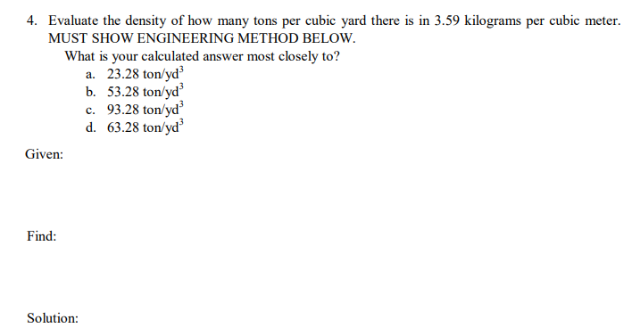 Since there are 2000 pounds in a ton this is 2700.2000 = 1.35 tons per cubic yard and thus 15 cubic yards weighs 1.35 × 15 = 20.25 tons. 85 lb/ft 3 = 2295 lb/yd 3 (1 pound per cubic foot equals 27 pounds per cubic yard) if you're in the us, divide 2295 by 2000 (there are 2000lb in a us ton). How to convert cubic yard to ton register. To cover the same amount of space at a depth of 6 inches, the volume will be 7.4 cubic yards and the estimated amount of material needed is 8.93 tons. The density of #4 limestone ballast: